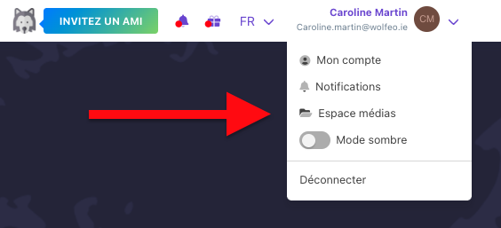 Pour commencer, accédez à l'espace médias en passant la souris par votre photo de profil Wolfeo :