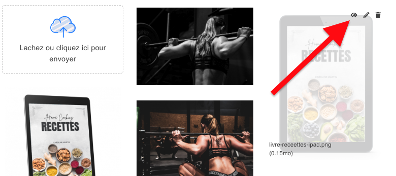 Une fois dans l'espace médias, repérez le fichier et passez la souris par l'élément pour faire apparaître ses réglages. Cliquez sur l'icône de l'oeil pour ouvrir le fichier :