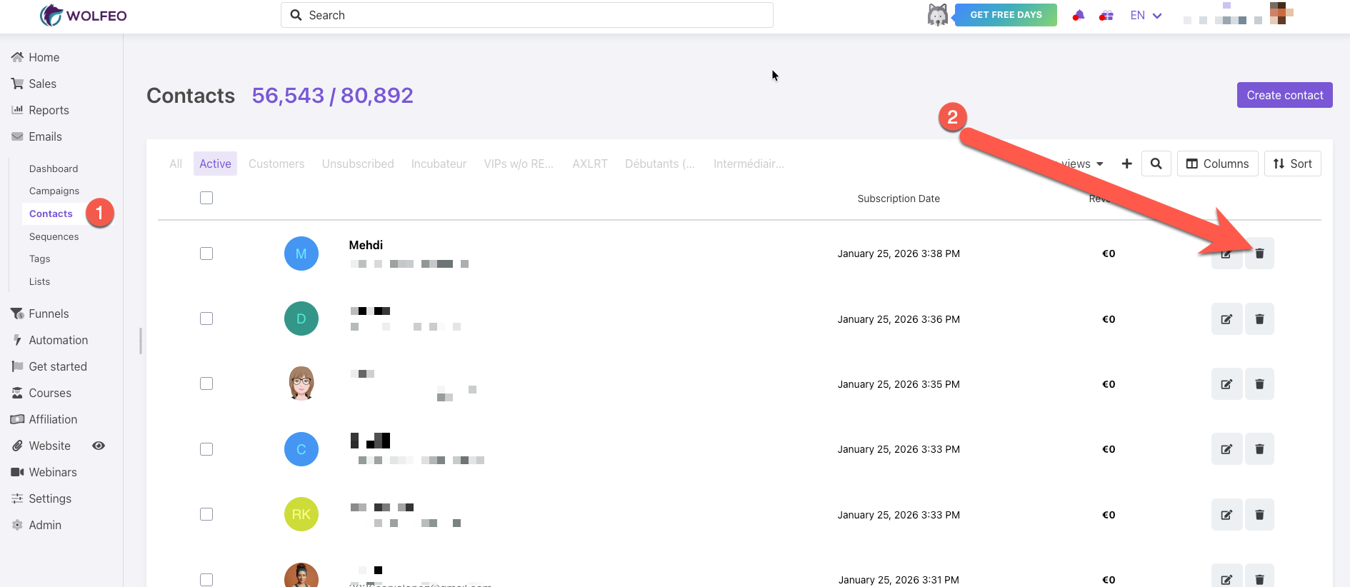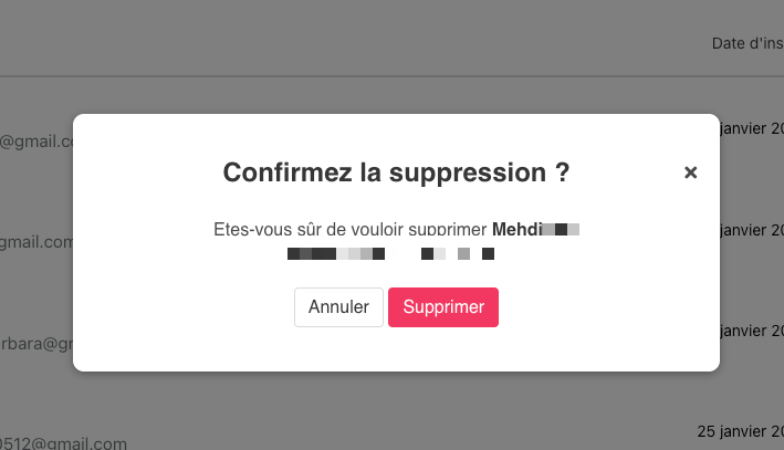 Comment supprimer un contact ? Dans la section contacts, repérez le contact à supprimer puis cliquez sur la poubelle : Teminez en confirmant l'opération :